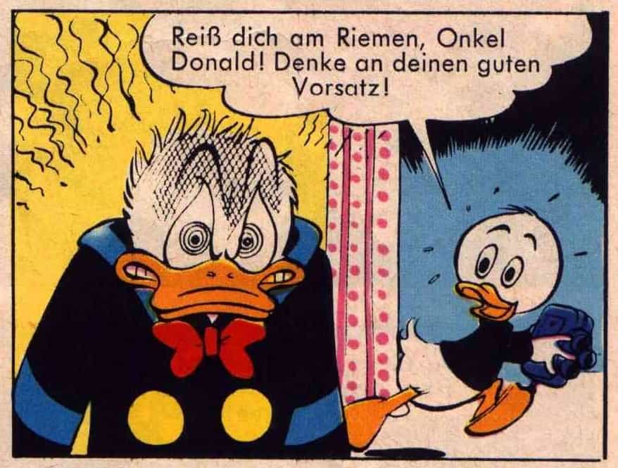 Naja, Donald, im Bild 1 verspeist Donald Süßspeisen, die er für seine Neffen zubereitet hat, um sie zum Bruch deren Neujahrsvorsatzes zu bewegen,