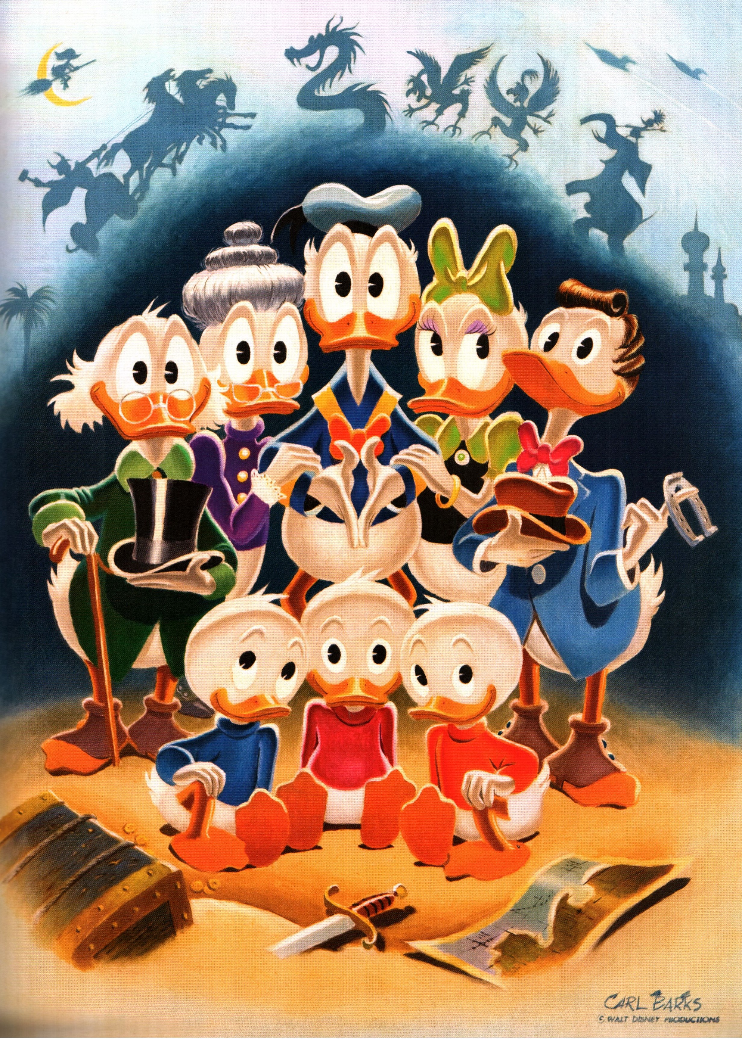 Aber in der Barks Collection ist im Band 12 auf Seite 100 das Bild eines Ölgemäldes des Großen Meisters zu sehen, auf dem drei Neffen erkennbar sind. Und von denen hat einer eine gelbe Mütze und ein gelbes Hemd. Es muss also im Willen Barks gelegen haben, einen vierten Neffen bildlich zu erwähnen.